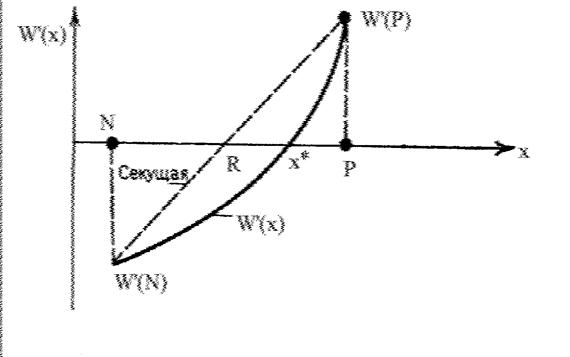 Сущность метода . Ориентирован на нахождение корня уравнения W'(x) в интервале [a,b], в котором имеются две точки N и P, в которых знаки производных различны. Алгоритм метода хорд позволяет аппроксимировать функцию W'(x) "хордой" и найти точку, в которой секущая графика W'(x) пересекает ось абсцисс.