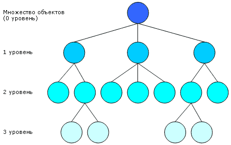 При иерархической системе классификации множество объектов (0-й уровень) делится в зависимости от выбранного классификационного признака на классы (группировки), образующие 1-й уровень. Каждый класс 1-го уровня в соответствии со своим классификационным признаком делится на подклассы (2-й уровень). Каждый подкласс 2-го уровня делится на группы (3-й уровень) и т.д.