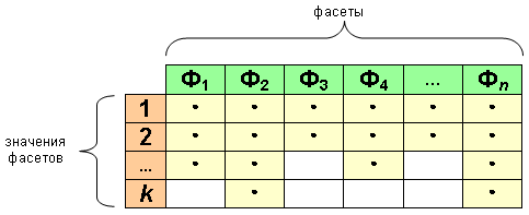 Фасетная система классификации позволяет выбирать признаки классификации независимо как друг от друга, так и от семантического содержания классифицируемого объекта. Признаки классификации называются фасетами. Каждый фасет (Фi) содержит совокупность однородных значений классификационного признака. Значения в фасете могут располагаться в произвольном порядке. Классификация (Ks) заключается в присвоении значений из фасетов: Ks=(Ф1,Ф2,...,Фn). При построении фасетной системы классификации необходимо не повторять значений в различных фасетах.
