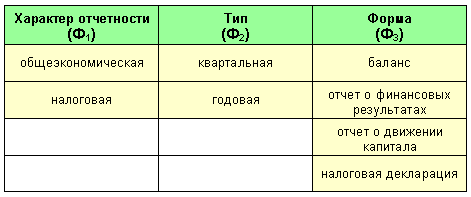 Здесь фасетами являются: характер отчетности, тип, форма. В столбцах приведены их значения. Тогда классификация имеет вид: