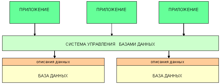 Базы данных работают под управлением систем управления базами данных, которые определяют как совокупность языков и программ, необходимых для работы с базой данных. СУБД позволяют создавать базы данных, вносить и изменять информацию в них, осуществлять доступ к этой информации. Схема организации программного и информационного обеспечения в случае использовании СУБД будет принципиально иной: