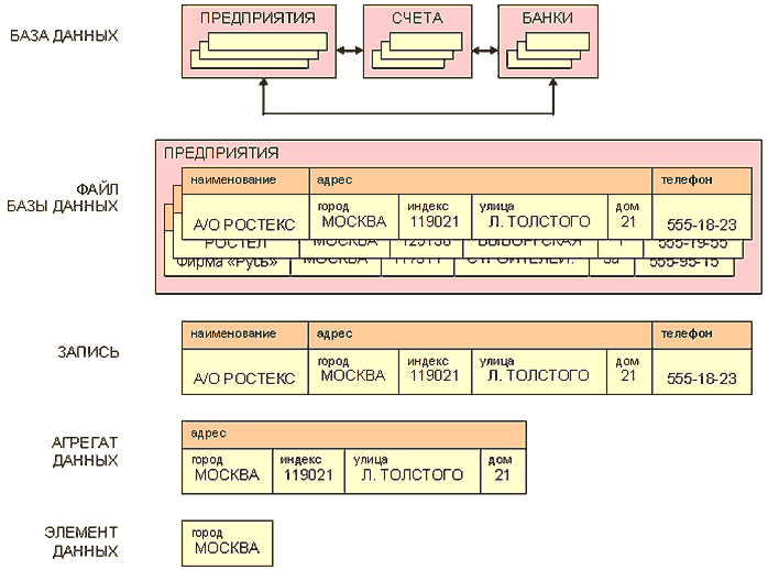 Элемент данных содержит один реквизит, в данном случае, название города «Москва». Агрегат данных состоит из несколько реквизитов, совокупность которых можно рассматривать как одно целое. Запись состоит из одного или нескольких элементов данных и содержит информацию об одном объекте, в приведенном примере - об одном предприятии. Совокупность однотипных записей составляет файл базы данных, на схеме - это файл с информацией о предприятиях. Совокупность таких файлов, тем или иным способов взаимосвязанных между собой, представляет собой базу данных. На схеме показано три файла информации, связанной между собой следующим образом: «предприятия обслуживаются банками, у них открыты счета в этих банках». Если связи между файлами нет, то их совокупность нельзя считать базой данных.