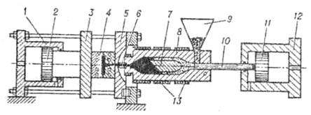 Инжекционный механизм состоит из рассекателя (торпеды) 7, расположенного в инжекционном обогреваемом цилиндре 8, бункера 9 с весовым или объемным дозатором для перерабатываемого материала и инжекционного поршня 10, который перемещается под действием плунжера 11, расположенного в гидравлическом цилиндре 12. Обогрев инжекционного цилиндра осуществляется электрическим обогревателем 13.