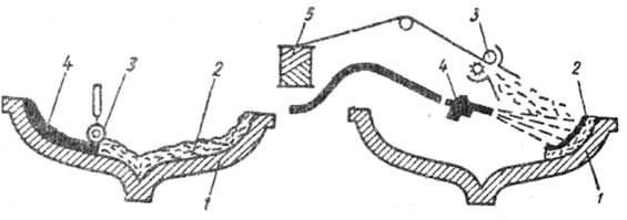 Сущность метода напыления (рис.7.,б) заключается в одновременном нанесении на поверхность формы рубленного волокна и связывающего. Cтекложгут 5 проходит режущее устройство 3 и напыляется на поверхность формы 1. В эту же зону формы распылительным устройством 4 подается связующее. После нанесения слоя заданной толщины композиция 2 уточняется на поверхности формы прикатывающими валиками.