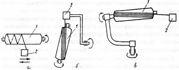 Рис.10. Типы намотанных станков: а) с возвратно-поступательным движением раскладчика; б) с вращением раскладчика; в) с неподвижным раскладчиком и вращающийся в двух плоскостях оправкой.