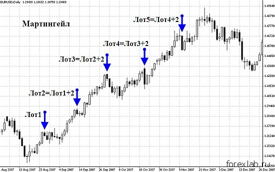 Метод мартингейла популярен среди поклонников азартных игр. Его суть заключается в увеличении размера последующих сделок по мере роста убытков (уменьшении торгового баланса), то есть после убыточной сделки происходит удвоение лота с целью покрытия убытков. Теория этого метода базируется на том, что убытки рано или поздно закончатся, таким образом, вход в игру следует осуществлять после длительных одинаковых результатов с целью получить противоположный итог. В конце концов, либо серия убытков закончится, либо деньги.