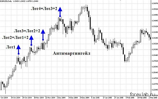 Мартингеил означает увеличение размера позиции при снижении капитала, а антимартингеил, наоборот, – увеличение размера позиции при росте капитала. Единицей увеличения или снижения позиции является число лотов или процент средств, который определяется предварительно. Данный метод управления капиталом считается одной из разновидностей метода пирамидинга, только в отличие от строительства пирамиды, здесь условиями изменения объема являются финансовые результаты предыдущих сделок, а не показатели технического анализа и поведение цены.