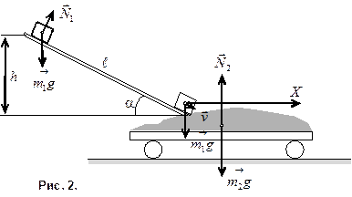 (рис. 2), не равна нулю. Поэтому применить закон сохранения импульса к системе ящик-тележка нельзя. Но так как проекция суммы указанных сил на направление оси x, совпадающей с направлением рельсов, равна нулю, то составляющую импульса системы в этом направлении можно считать постоянной, т.е.