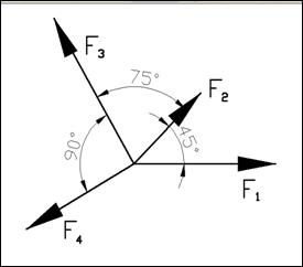1-тапсырма: берілген жазық тоғысатын күштер жүйесі үшін (1-суретті қараңыз) F1=30 H, F2=20 H, F3=45 H, F4=50 H болғанда, оның тең әсерлі күшінің шамасы мен бағытын графикалық тәсілмен AutoCAD жүйесін қолданумен анықтау керек.