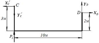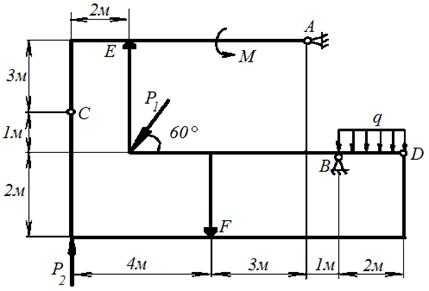1-тапсырма:9-суретте көрсетілген құрама құрылымның сыртқы және ішкі байланыстарының реакцияларын келесі деректер үшін анықтау керек: P1=10 кН, Р2=3 кН, М=20 кНм, q=2 кН/м. Саңылаулары жоқ, сыртқы жүктемені алғанда сыртқы және ішкі байланыстарда реакция нөлге тең болады. Шешімді Mathcad жүйесі қолданумен жүргізу керек.
