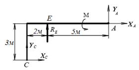 Құрылымды 3 бөлікке жіктеп алып, сыртқы және ішкі байланыстардың реакцияларын көрсетеміз. Есеп шартында бір жақты байланыстардың қайсысында (Е немесе F нүктесінде)реакция орын алатыны берілмеген, сондықтан екі жағдайды да қарастыру керек.