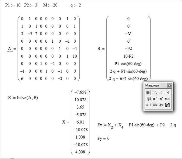 2-тапсырма: Mathcad құжатында түсірілген күштердің мәндерін өзгертіп, сандық эксперимент жүргізу және әр жағдайда бір жақты байланыстардың қайсысы істе болатынын анықтау керек.