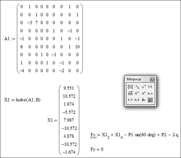 Теңдеулер жүйесін Mathcad бағдарламасындағы lsolve(A,B) функциясын қолданумен шешу және шешудің дұрыстығын тексеру үлгісі 13-суретте көрсетілген. Матрицалар мен матрица элементтерінің индекстерін енгізгенде Матрица атты құрал-саймандар панелін қолдану керек.