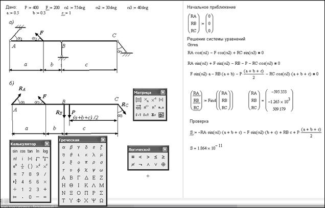 Mathcad жүйесін қосып, 7 суретте көрсетілгендей берілгендерді енгіземіз және есептеуді жүргіземіз (есептеу сұлбасын сызу керек емес). Ыңғайлық үшін бірден пернетақтаны ағылшын тіліне аударып, Вид (Түрі)мәзірінен Калькулятор және Греческая атты құрал-саймандар панельдерін экранға шығарған жөн.
