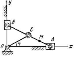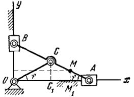 1-тапсырма: эллипсограф М нүктесі үшін (20-суретті қараңыз) қозғалыс теңдеулерін координаттық түрде ОС=АС=СВ=l, AM=r=0,5l, l=50 см, φ=πt болғанда құру керек.
