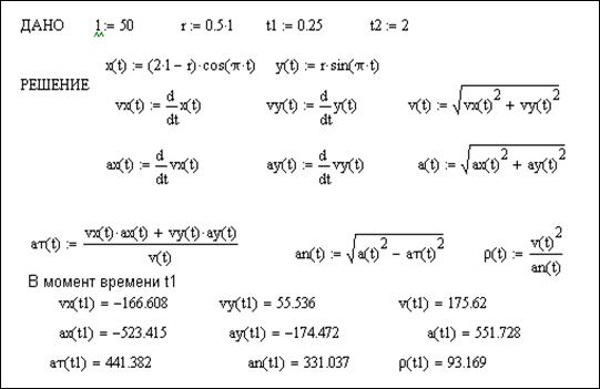 Mathcad құжатында деректер мен формулаларды енгізіп, t1 уақыт мезгілінде нүктенің кинематикалық сипаттамаларын 23-суретте көрсетілгендей есептейміз.