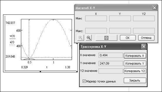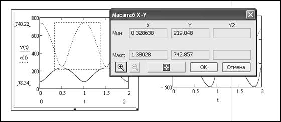 батырмасын басамыз). Екі өлшемді график шаблоны шыққан соң аргумент осіндегі және ординат осіндегі толтырылмаған өрістерді толтыру керек. Біздің жағдайда бірінші график үшін аргумент осінде t тереміз, ординат осінде арасына үтір қойып v(t) және a(t), осыған қосымша аргумент осінде уақыт аралығының шектерін енгіземіз: сол жақта 0, оң жақта t2 (24-суретті қараңыз). Ординат осінде шамалар өзгеру шектерін қоймаймыз. Содан кейін тінтуірді графиктен тыс кез келген нүктеде шырт еткізу керек, сонда график тұрғызылады.