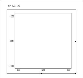 Нүкте траекториясын тұрғызу үшін, алдымен, уақыт аралығын 0 -ден t2 –ге дейін 0.01 қадамымен 29-суретте көрсетілгендей береміз (0.01 -ден кейін «..» енгізу үшін «;» белгісін қою керек). Екі өлшемді график шаблонын пайдаланамыз, сол кезде аргумент осінде x(t), ал ординат осінде y(t) береміз және екі осьте де өзгеру аралығын -100 –ден 100- ге дейін енгіземіз(29-суретті қараңыз). Мұнда траектория бұрмаланбай көрсетілу үшін екі ось бойынша бірдей масштабты орнату керек, ол үшін контексті мәзірінде Формат… таңдау керек, содан кейін Оси X-Y бөлігінде жалаушаны Равные масштабы (Бірдей масштабтар) жанында орнату керек (30-суретті қараңыз).