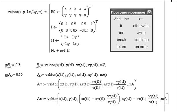 Траекторияда жылдамдық пен үдеулер векторларын көрсету үшін vector(x,y,Lx,Ly,m) аттықолданушының ішкі бағдарлама-функциясын қолданамыз, мұнда параметрлер келесіні белгілейді: x,y – вектор басының координаталары, Lx, Ly – вектордың координат осьтеріне проекциялары, m – масштаб коэффициенті.