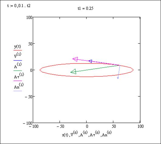 Содан кейін траекториясы тұрғызылған графиктің көшірмесін жасап, оны төменде орнатамыз. Формат орнату панелін шақырып, Графики атты бөлігінде Трассировка 1 - Трассировка 5 сызықтары үшін сызық түрін тұтас және сәйкес қызыл, көк, жасыл, сия көк, көгілдір түстерін орнатамыз. Содан кейін аргумент және ординат өрістерін үтір қойып толықтырамыз, нәтижесінде траектория үстінде t1 уақыт мезгіліндекелесі векторлар көрсетіледі: жылдамдық – көк, толық үдеу - жасыл, жанама үдеу – сия көк, нормаль үдеу – көгілдір түспен (33-суретті қараңыз). 33-суретте көрсетілгендей нүкте жылдамдығы траекторияға жанама бағытталады, жанама үдеу бағыты жылдамдықпен бірдей, яғни қарастырылатын уақыт мезгілінде қозғалыс үдемелі болып тұр. Нормаль үдеу нормаль бойымен (яғни жанамаға перпендикуляр) және траекторияның ойыс жағына бағытталып тұр.