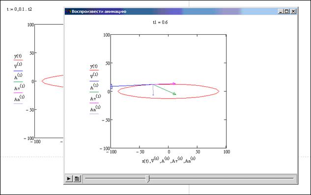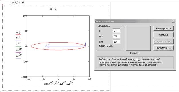 формуласын енгіземіз (сонда кадрлар саны 50 тең болады, t1 уақыты 0 -ден t2 –ге дейін өзгереді). Траектория мен векторлар көрсетілген график алдында t1= енгіземіз, сонда жүйе оның бастапқы мәнін береді: t1=0. Траекториядағы жылдамдық пен үдеулер векторлары тап сол уақыт үшін көрсетіліп тұрады (34-суретті қараңыз). Анимациялық клип жасауға арналған команданы Инструменты→Анимация→Запись… мәзірі арқылы қосамыз, шыққан Запись анимации (Анимацияны жазу) диалог терезесінде FRAME айнымалысы үшін бастапқы мәнін 0, соңғы мәнін 50 енгіземіз және көрсету жылдамдығын 10 кадр секундына деп береміз, сонда клип ұзақтығы 5 секундаға тең болады. Содан кейін Mathcad-құжатының бөлігін 34-суретте көрсетілгендей тінтуірмен белгілейміз.
