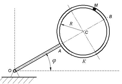 заңы бойынша қозғалады, ал К денесі О нүктесінен сурет жазықтығына перепендикуляр өтетін қозғалмайтын ось төңірегінде φ=πt/2 заңы бойынша айналмалы қозғалыс жасайды. Келесі өлшемдер берілген: OA=20 см, R=10 см. Жылдамдықтарды қосу туралы және үдеулерді қосу туралы теоремаларды қолданып, М нүктесінің t1=1,05 cек уақыт мезгілінде абсолют жылдамдығы мен абсолют үдеуін Mathcad жүйесінде аналитикалық және AutoCAD жүйесінде графикалық тәсілмен анықтау керек.