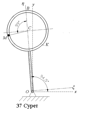 Қозғалатын Оξη координат жүйесін К денесімен байланыстырамыз және К денесі мен М нүктесінің t1 уақыт мезгілінде орналасуын анықтаймыз. t1=1,05 cек болғанда К денесінің айналу бұрышы φ=π·1,05/2=0,525π рад= =0,525π·180/π=94,5º. Осы уақыт мезгілінде М нүктесінің К денедегі орнын анықтайтын α центрлік бұрышын табамыз: