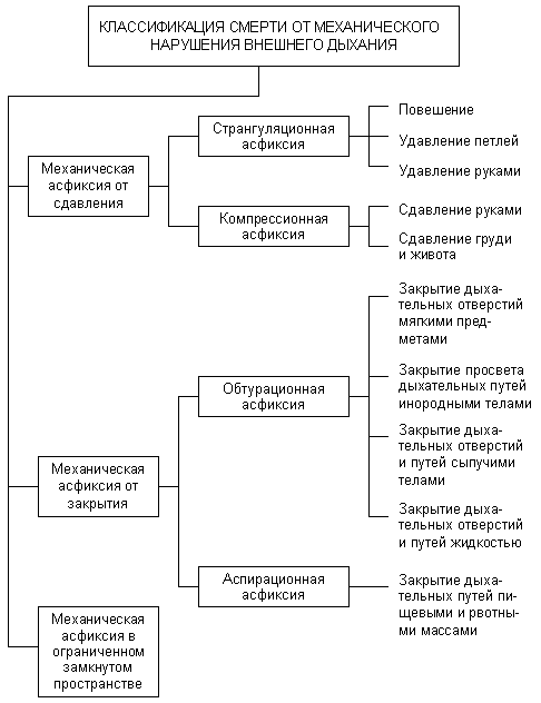 Классификация механической асфиксии в зависимости от механического фактора и места приложения его действия.