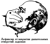 В судебно-медицинской практике встречается редко и осуществляется путем прижатия какого-либо мягкого предмета: подушки, шарфа, платка или раскрытой ладони человека. Как правило, задушение таким способом встречается в отношении людей, находящихся в бессознательном состоянии, у ослабленных больных, в состоянии алкогольного опьянения, во время сна, а также новорожденных детей.