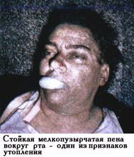 - белая, стойкая мелкопузырчатая пена у отверстий носа и рта, образуется в результате перемешивания воздуха с водой и слизью дыхательных путей, пена держится 2-3 дня, при высыхании на коже остается тонкая мелкоячеистая пленка;