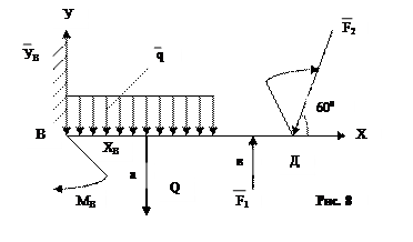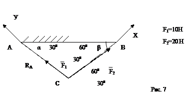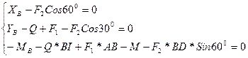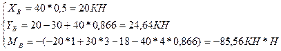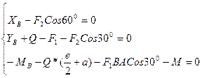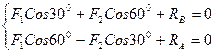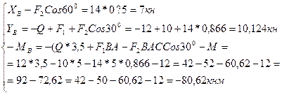 RB = -F1Cos300-F2Cos600 = -10*0,866 – 20*0,5 = 18,66 (Н)