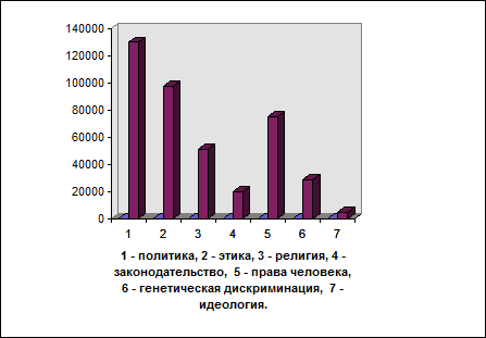 Необходимо подчеркнуть и еще одно немаловажное обстоятельство. Как правило, социокультурные аспекты генетики существуют, как в зависимости друг от друга, так и от их конкретно-научной основы, образуя, в конечном счете, своеобразные “гибридные” ментальные образы. В пользу такого вывода говорит значительное количество web -страниц, на которых отдельные семантические структуры представлены в корреляционной связи друг с другом. К их числу можно отнести политические и этические аспекты генетики. Семантическая ассоциация между этими аспектами генетических теорий и их практическим воплощением в менталитете достаточно выражена. Если принять в качестве меры ее выраженности, процентную долю web -страниц, общих для различных “субпопуляций”, то для этики и политики этот показатель достигает 28 пунктов из теоретически возможных 100 (Рис. 1. VI на с. 18). Этот показатель, по нашему мнению, свидетельствует о том, что не только степень политизации генетики (как и всего естествознания) и ее участия в этических коллизиях, но и уровень этической мотивации (по крайней мере, публично выражаемой), оказывает существенное влияние на модус поведения не только отдельной личности, но и общества в целом.