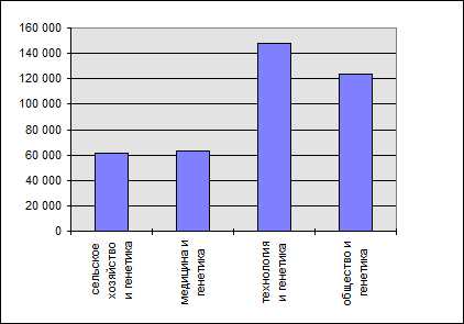 Среди социальных проблем генетики по степени общественной заинтересованности занимают, безусловно, (рис. 1. III) политика (genetics+policy) и этика (genetics+ethics)— 130 000 и 97 800 web-страниц соответственно, а также взаимоотношения генетики и генных технологий с религиозными учениями (genetics+religion) — 51 400. При этом наибольший резонанс имеют вопросы соблюдения прав человека (genetics+human rights) и возможной дискриминации, связанной с получением информации о генетической конституции индивидуума (genetics+discrimination). Идеологические интерпретации достижений генетиков мало кого волнуют. И все же влияние генетический теорий и созданных на их основе технологий вызывает больше тревоги (danger и risks), чем положительных эмоций (рис. 1. IV), связанных с потенциальными выгодами (benefits) — 67 против 33 пунктов. Для сравнения: из более чем 1,55 млн. web -страниц, где встречается термин “экология”, на 157 000 web -страниц он ассоциирован с “благом” (benefits) и лишь на 5 (пяти) — с риском или опасностью. В последнем случае, речь идет не об экологии как науке, а о потенциальных, отрицательных экологических последствиях различных процессов или событий.