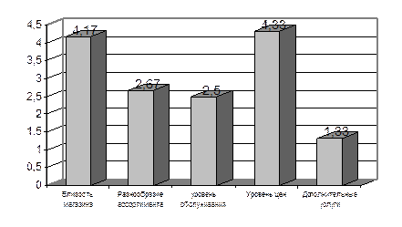 Как видно из анализа опроса, основной причиной выбора места покупки является уровень цен (4,33 балла) и места покупки к месту проживания или работы (4,17 баллов).