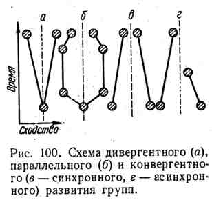 Дивергентная эволюция обусловливает распад одного таксона на несколько групп в процессе приспособления их к разным.условиям существования (рис. 100). Дивергентная эволюция осуществляется на разных уровнях. Она расчленяет вид на популяции, которые при возникновении изоляции могут превратиться в новые виды. Виды одного