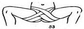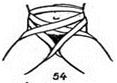 Повязки на промежность. Обычно достаточно Т-образной повязки (рис. 27) или повязки на обе паховые области, но лучше сделать перед ее наложением восьмиобразные ходы вокруг бедер (рис. 53). Более сложная повязка — с ходами бинта, перекрещивающимися на промежности (рис. 54).