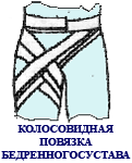 ·Колосовидная повязка. Проводят круговой ход бинта вокруг поясницы, затем делают петлю через пах по задней поверхности бедра и снова по передней стороне бедра и живота к пояснице.