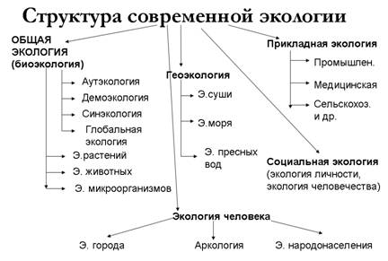 Схема. 1. 1 Структура современной экологии. Главным из всех направлений современной экологии является изучение выживания живых существ в окружающей среде. Поэтому основной, частью экологии как биологической науки является общая экология (биоэкология), которая изучает закономерности взаимоотношений живых организмов, популяций и сообществ друг с другом и окружающей средой. В составе биоэкологии выделяют следующие разделы: - аутэкология (экология особей) - изучает влияние экологических факторов на отдельные организмы (вид, особь); - демоэкология (экология популяций) - изучает структуру и динамику популяций отдельных видов; - синэкология (биогеоценология, экология экосистем) - изучает законы существования и свойства сложных сообществ организмов как единых систем. - глобальная экология - изучает биосферу как глобальную экосистему, образованную из совокупности биогеоценозов (экосистем). По конкретным объектам исследования в биоэкологии различают экологию растений, экологию животных, экологию микроорганизмов и др. Раздел - геоэкология изучает биосферные оболочки Земли (атмосферу, литосферу, гидросферу) и требует интеграции геологии и географии, почвоведения и геохимии, гидрогеологии и гидрологии и др. в единую систему знаний. По конкретным средам исследования в геоэкологии различают экологию суши, экологию пресных вод, экологию моря, экологию высокогорий и др.Прикладная экология представлена комплексом дисциплин, связанных с различными областями человеческой деятельности. На стыке экологии с другими отраслями знаний развиваются такие направления как сельскохозяйственная экология, промышленная экология, химическая экология, промысловая экология, медицинская экология, природопользование и др. Все эти направления изучают сложные проблемы взаимодействия человека с окружающей средой, разрабатывают способы предотвращения разрушения биосферы человеком и разрабатывают принципы рационального природопользования. В конце 20 века появилась и существует - социальная экология, которая изучает взаимоотношения в системе «человеческое общество-природа» и определяет: специфическую роль человека в системах различного ранга, отличие этой роли от роли других живых существ, пути оптимизации взаимоотношений человека со средой, теоретические основы рационального природопользования. Экология человека, рассматривает взаимодействие человека как биосоциального существа с окружающей его природной, социальной и культурной средами. В ее рамках развиваются: экология города, экология народонаселения, аркология (архитектурная концепция, предложенная итальянским архитектором П. Солери в 1919 г.; он предложил решать урбанистические проблемы 20 века путем строительства гигантских вертикальных сооружений способных вмещать миллионы жителей). Таким образом, в последние десятилетия современная экология фактически вышла за рамки только биологии и переживает колоссальное развитие в различных направлениях. Отсюда вытекает многообразие объектов, методов и средств экологических исследований, многие из которых, оказываются, заимствованы из смежных областей знаний. Задачи современной экологииn разработка общей теории устойчивости биологических систем; n изучение экологических механизмов адаптации живых организмов к окружающей среде; n ис