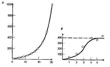 Рис. 14.2. Экспоненциальная (теоретическая) (а) и логистическая (реальная) (б) кривые роста популяций.