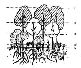 Ярусы (I—V) особенно хорошо заметны в лесах умеренного пояса (рис. 14.4). В них можно выделить 5-6 ярусов:первый (верхний) ярус образуют деревья первой величины (дуб черешчатый, липа сердцевидная, вяз гладкий и др.); второй — деревья второй величины (рябина обыкновенная, дикие яблоня и груша, черемуха и др.); третийярус составляет подлесок, образованный кустарниками (лещина обыкновенная, крушина ломкая, бересклет европейский и др.); четвертый ярус состоит из высоких трав (чи-стец лесной, крапива, сныть обыкновенная) и кустарничков (черника); пятый ярус сложен из низких трав (осока волосистая, копытень европейский); в шестомярусе — мхи, лишайники.