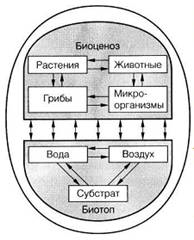 Основу любой экосистемы составляют живые организмы (живое вещество, биота), которые характеризуются биотической структурой, и среда обитания, обусловленная совокупностью экологических факторов. Условия жизни в экосистемах называют биотопом (местообитание), а все его взаимодействующее живое население биоценозом (сообщество) (рис. 2. 2). Биоценоз и биотоп функционируют в непрерывном единстве. Биотоп служит для организмов источником средств жизни (минеральных солей, влаги, углекислоты, кислорода, энергии и т.п.), и в него же они выделяют продукты своей жизнедеятельности (листовой опад, экскременты, органические кислоты, влагу, газы и др.). Биотоп может обладать богатыми условиями и предоставлять возможность поселения в нем большому числу организмов, а может быть таким, что видовой состав обитателей будет невелик. То есть от биотопа зависит степень сложности структуры экосистем, направление и типы взаимосвязей между организмами, темп и скорость круговорота веществ. В тоже время каждый конкретный биоценоз всегда преобразует свой биотоп. Таким образом, биотоп это некое географическое пространство, место (экотоп) преобразованный биоценозом для «себя».