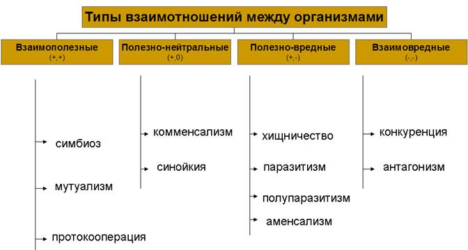 Кроме того, для обозначения позиции вида при разных формах связи используют условные обозначения - «+», «-», «0». Знак «+» означает, что один из организмов получает пользу, знак «-» показывает, что организм в результате отношений с другими организмами испытывает угнетение или вред, а знак «0» свидетельствует, что данные отношения не дают для организмов видимого эффекта или безразличны (рис. 2. 6).