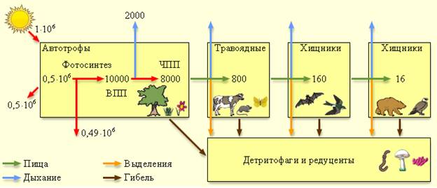 Первичная продукция подразделяется на два уровня – валовую и чистую продукцию. Валовая первичная продукция – это общее количество созданного органического вещества, включая и траты на дыхание (растения на дыхание тратят от 40-до 70 % валовой продукции). Оставшаяся, после расходов на дыхание и корневые выделения, часть называется чистой первичной продукцией. Синтезированная масса в виде белков, жиров, углеводов и других органических соединений расходуется на дыхание растений, потребляется консументами, перерабатывается редуцентами, а также захоранивается в виде залежей торфа, угля или сланцев, которые накапливаются в большом количестве. Первичная продукция, захваченная консументами в виде корма, расходуется ими на процессы жизнедеятельности и идет на построение вторичной продукции (т. е. биомассы фитотрофов). Часть первичной продукции возвращается в окружающую среду в виде экскрементов, выделений и трупов. Запасенные в фитотрофах масса и энергия (в количестве примерно до 20 %) передаются следующему уровню потребителей, обеспечивая их существование, разнообразие и численность. Вещества, вышедшие в окружающую среду, могут быть вновь вовлечены в круговорот живыми организмами. Таким образом, экосистемы поддерживает свою жизнедеятельность благодаря, наличию в окружающей среде энергии Солнца и способности живых организмов улавливать и концентрировать эту энергию, а использовав - рассеивать в окружающую среду. Все продуценты, консументы и редуценты – составляют общую биомассу (живой вес) сообщества в целом или его отдельных частей, тех или иных групп организмов. Биомассу обычно выражают через сырой и сухой вес, но можно выражать и в энергетических единицах - калориях, джоулях и т. п. (табл. 3).