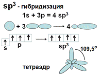 Однако, 4 негибридных неспаренных электрона еще не могут образовать 4 связи. Для этого они должны иметь одинаковую форму АО и располагаться на одинаковом расстоянии от ядра атома. Это происходит после гибридизации АО - выравнивания электронных орбиталей по форме и энергии. В результате sp3 –гибридизации одна s и три р- АО образуют 4 одинаковых по форме и энергии АО в виде неправильной объемной «восьмерки».Они располагаются на максимальном расстоянии друг от друга и образуют тетраэдр с валентным углом 109,5°. В результате атом углерода может образовать 4 одинарных связи, азота – три, кислорода – 2.