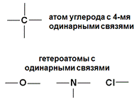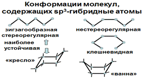 Таким образом, пространственное строение органических молекул, образованных sp3 -гибридными атомами определяется тетраэдрическим строением каждого атома и различными геометрическими формами, которые возникают в результате вращения атомов вокруг одинарных связей (т.н. конформациями). Конформации ациклических молекул могут быть зигзагообразными стереорегулярными, нестереорегулярными и клешневидными. В первом случае возникает наиболее термодинамически выгодное состояние молекулы, так как расстояние между соседними атомами становится максимальным. Циклические соединения: 6-членный циклогексан может иметь конформации «кресло» и «ванна». Конформация «кресло» наиболее стабильная, все атомы максимально удалены друг от друга.