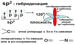 При sp2 –гибридизации одна s и две р- АО образуют 3 sp2- гибридных АО, четвертая р- АО остается негибридной. Гибридные орбитали располагаются под углом 120° и образуют плоскость, негибридная р- орбиталь располагается перпендикулярно плоскости (рис.).