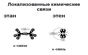 Химические связи. s-Связь возникает при осевом перекрывании любых АО, p-связипри боковом перекрывании р-орбиталей. Онимогут быть локализованными (этан и этен) и делокализованными. В делокализованной связи электроны принадлежат более, чем двум атомам. Делокализованные связи прочнее локализованных так как в результате делокализации: