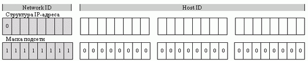 Старший бит любого IP-адреса в сети класса А всегда равен 0. Идентификатор сети состоит из 8 бит, идентификатор узла — 24 бита. Маска подсети для узлов сетей класса A — 255.0.0.0. Структура IP-адресов класса А приведена на рис. 4.2.