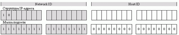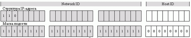 Соотношение между идентификатором сети и идентификатором узла в IP-адресе определяется с помощью маски подсети (Network mask), которая имеет длину также 4 байта и также записывается в десятичной форме по 4 октета, разделенных точками. Старшие биты маски подсети, состоящие из 1, определяют, какие разряды IP-адреса относятся к идентификатору сети. Младшие биты маски, состоящие из 0, определяют, какие разряды IP-адреса относятся к идентификатору узла.