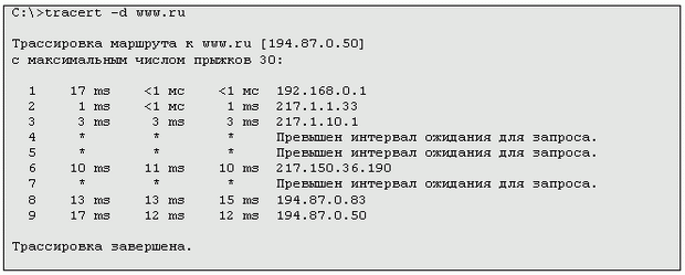 Трассировка маршрута до узла www.ru (если в вашем распоряжении только одна IP-сеть, то изучить работу данной команды будет невозможно).